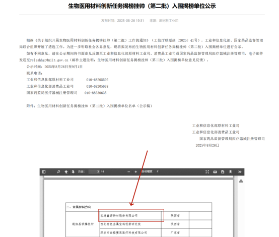 2025年8月26日,工业和信息化部联合国家药品监督管理局发布《生物医用材料创新任务揭榜挂帅(第二批)入围揭榜单位公示》,宝鸡鑫诺特材股份有限公司(以下简称“鑫诺特材”)凭借在超细晶钛棒丝材领域的技术突破,成功入围金属材料方向项目名单。此次入围标志着鑫诺特材在高端生物医用材料领域的技术实力获得国家级认可,也为我国突破医用钛合金关键核心技术、推动高端医疗器械自主可控提供了重要支撑。